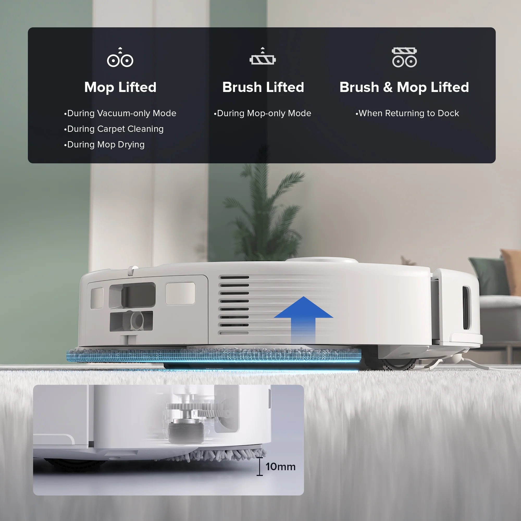 Tự động nâng giẻ lau lên đến 10mm khi phát hiện sàn thảm, không cần lo lắng robot làm ướt thảm.