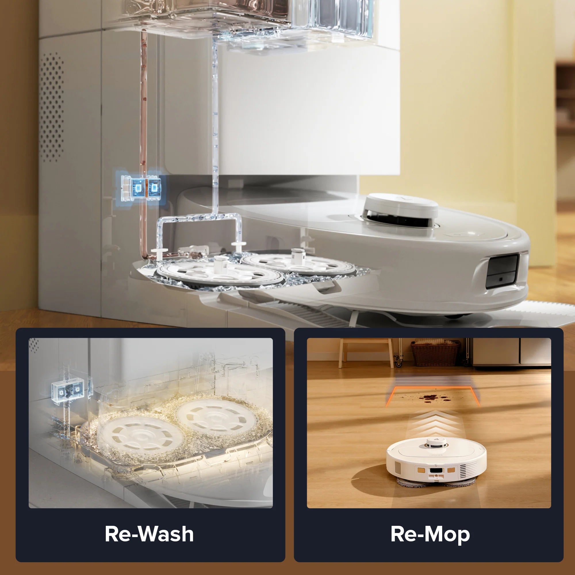 Khi robot hút bụi tự động giặt giẻ lau, hệ thống sẽ đánh giá độ bẩn của nước để xác định cần giặt lại giẻ hay không, đảm bảo giẻ sạch sẽ 100%.
