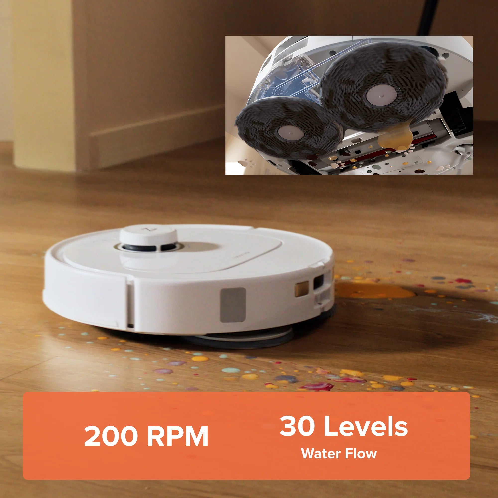 - Giẻ lau xoay kép với tốc độ quay 200 vòng/phút và 30 cấp độ tùy chỉnh